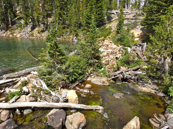 No Man Lake is definitely a dammed reservoir. Why is it dammed? I have no idea. A rock dam on the east side keeps the water in place. Decaying cement structures are built nearby and there are a few items (sledges, horseshoes, etc) from a different time scattered around the place. There are plenty of amazing places to camp too.