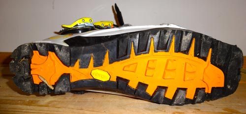 A size 27 only weights 3lbs, 7oz or 1571 grams. Scarpa also features a Vibram Cayman sole that can take a beating on rock, scree, and spring junk.