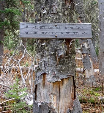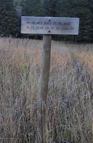 Without any hesitation we jumped right into bear aware tactics. Constant “hey bears,” “Ay-O’s”, and “koooo-wheee” echoed through the box canyon – not a place where we wanted to encounter a grizzly bear. Within 10 minutes, we saw a large vertebrae in the middle of the trail and stepped up the pace. After 1.8 miles, the trail splits in an open meadow. With a bit more light and the ability to see, we turned left on Trail 357 toward Helmet Pass.