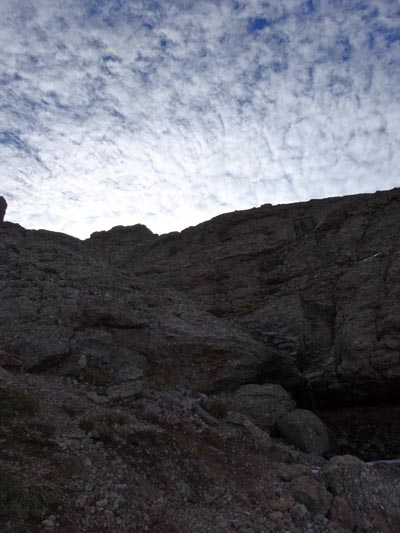 The trail works across a meadow. It then switchbacks through forests steadily gaining elevation. As we approached Helmet Pass at approximately 9,000 feet, the sun was just hitting the Helmet. The Helmet is a beautiful triangular rock formations with vertical walls stretching 100’s of feet above the pass. Mountain goats relaxed on its southern flanks as the sun hit the summit of the Helmet at 9653′. It took approximately 2 hours and 4.85 miles to reach the saddle.