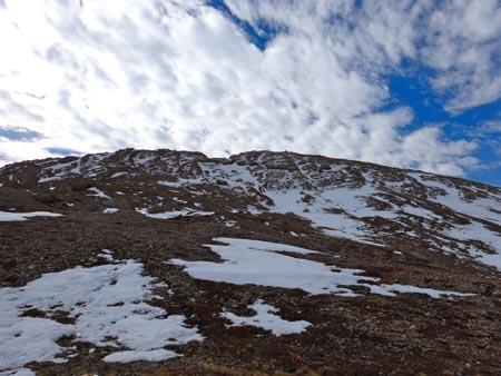 After a quick refueling stop, we headed east on an established climber’s trail. The trail climbs the western aspect of Sphinx Mountain. It was relatively easy to follow and has obviously been used by countless climbers. The trail treads over loose scree, around conglomerate faces, and heads consistently uphill. Pockets of snow and grassy tundra increased as we approached the summit. With a final class 3 push, we reached 10867′ and the summit of Sphinx Mountain – 3 hours 15 minutes from the trailhead.