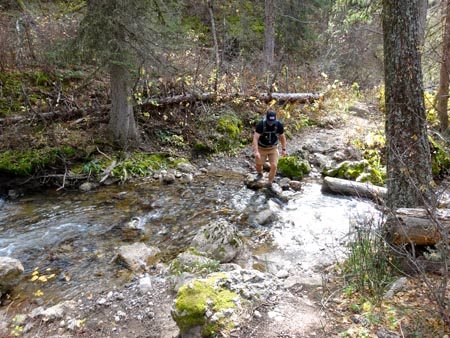 After the switchbacks, the trail works through the deep forests of the Lee Metcalf Wilderness. In 1.1 miles, the trail intersects Trail 325. Head west and follow the trail for 3.6 miles. In this section we saw giant moose prints, but our constant bear calls kept the grizzly bears away. There are four stream crossings and only one has a bridge. The crossings can be dangerous early season due to snow melt, but they were only ankle deep in October. Plan on getting your feet wet. We certainly did.