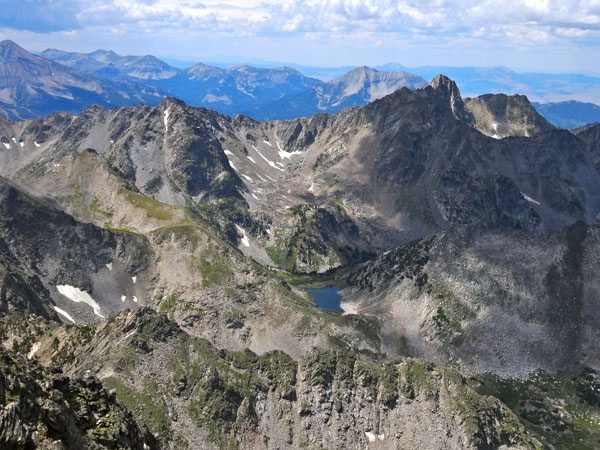 There are several campsites and the views are breathtaking. Gallatin Peak, the highest summit in the Spanish Peaks, at 11,015′ towers above the northeast end of the lake. The north fork of Hellroaring drops off into the distance. From the right vantage point, you can make out Beacon Point. To the southwest, you can see the Mirror Basin / Beehive Basin Saddle and Peak 10602.