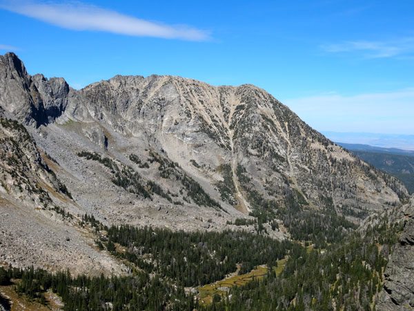 The views from the Saddle are spectacular. You can look back the way you came or glimpse down Mirror Basin as it meanders toward Spanish Creek and the north end of the Madison Range. The East Face of Blaze Mountain, which I recently heard called the Hummingbird Face, beckons in the distance. Peak 10602 towers to the west, and the rocky trail leads down into Mirror Basin towards Summit Lake.