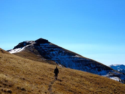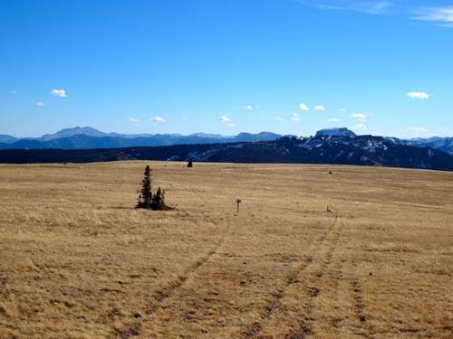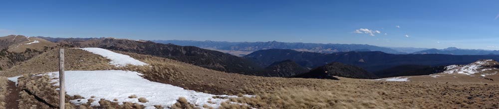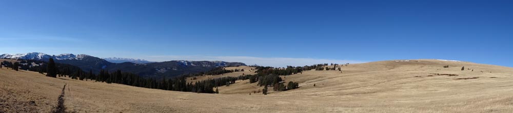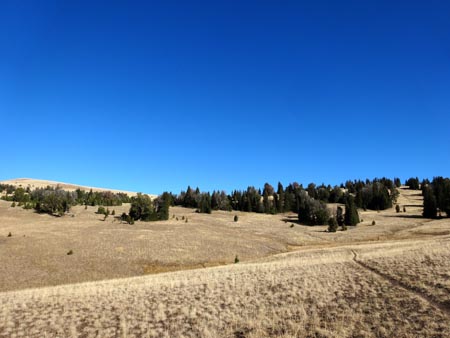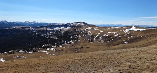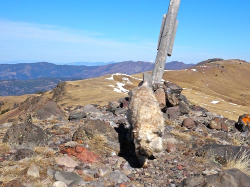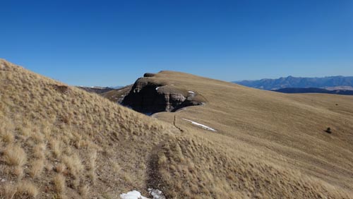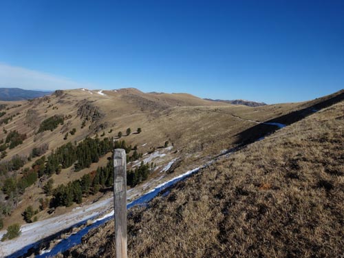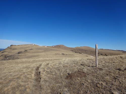 Follow the trail along the ridge. There are large wooden posts that mark the trail in case you get lost. It’s easy to head to the first high point, but the trail actually works around this to the west. On the NW side of this first summit, a narrow and sometimes snowy trail crosses a steep, rocky face – a place where we saw abundant wolf prints in the slick snow. After crossing this section, the trail becomes wide and grassy again.