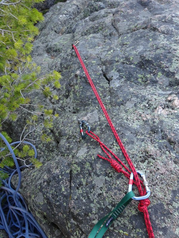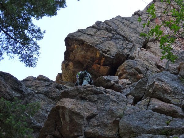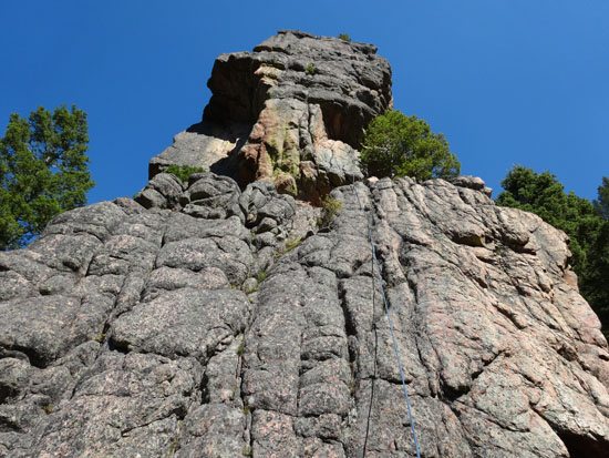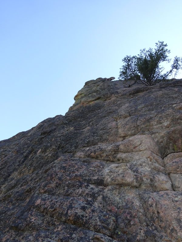 Pitch 3 is rated 5.8. We broke this up and climbed a hard to protect crack/scramble up to a treed ledge and set a second belay. From there we started on the right side near the tree and worked our way up and left on to the face. We’d been here before and cleverly avoided the sucker bolt on the right side of the formation. We ran into some rope drag issues, as we meandered up the face. Overall the pitch had easy to find large jugs to grab hold off and with a bit of simple footwork, it was a fun climb. The bubbly gneiss made it harder to protect than on the first two pitches. We zigged and zagged and quickly found our way to the top bolts. I didn’t think they were located in the best spot, but they worked.
