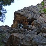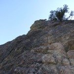 The 1st pitch is rated 5.7. It can be climbed directly from the base, but this ups it to a 5.10b due to the large roof. Instead, Opie and I skirted to the South of the formation and geared up. We climbed an easy 5.4 section up to a ledge where there are a couple of bolts. We flaked the rope and started climbing. Our route took us up the left side crack to a small roof and then we scrambled up a chimney to a set of bolts on a large ledge. Opie and I have also climbed the right side and a few other variations of this pitch. It’s decently easy to protect wherever we’ve traveled. At the top of pitch 1 there is a walk off – we headed to pitch 2.