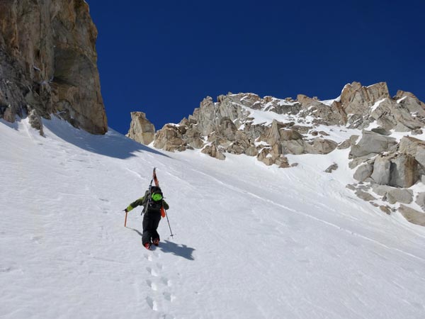 From here you can see Ski Dreams, and the East and West Couloirs of Matterhorn Peak. It’s absolutely stunning terrain. We skinned over the firm snow as far as we could then transitioned to crampons for the bootpack up the couloir. Our goal was the East Couloir, which is more north facing, but it looked scoured, rocky, and firm. The West couloir, which is more northeast facing, has two braids that we found to be about 40 degrees. It seemed to have been in the sun and we were hoping that it would soften.