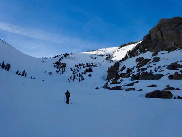 Traveling Up Horse CreekWe followed the summer trail for about 750′, but if the snow line was lower you’d easily be able to start skinning sooner. The ascent route basically follows Horse Creek over meandering terrain toward the alpine.