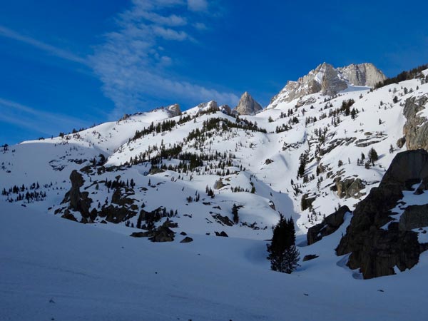 We followed the summer trail for about 750′, but if the snow line was lower you’d easily be able to start skinning sooner. The ascent route basically follows Horse Creek over meandering terrain toward the alpine.
