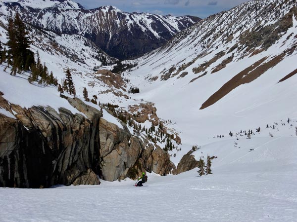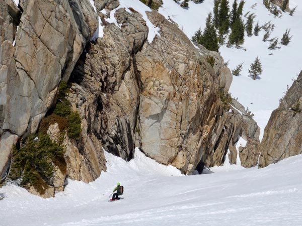 Luckily, the snow was corned up down low and we arced a few turns down to a lower chute that dropped us back down to Horse Creek. Once we reached this point, the goal was to stay as high skier’s right as possible because the valley bottom was a complete slog. It took a lot of time and effort to get out of Horse Creek.