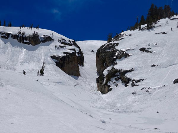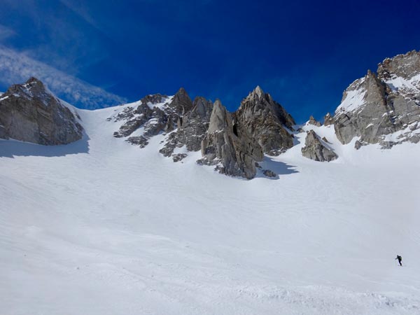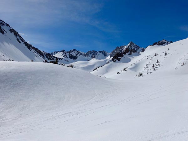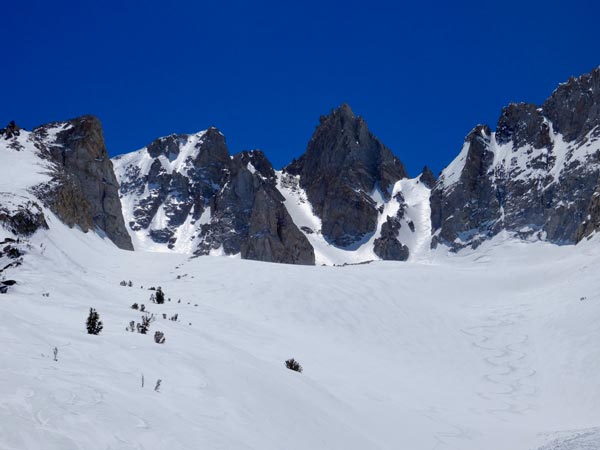 Eventually we decided to ski. The best way to describe it is sporty and loud. We regrouped once. Hop turns and side slips were the only way to ski that piece of terrain in those conditions. When we reached the apron, we noticed another group. They had watched us ski and decided to turn around and leave. Looking back up the snow on Matterhorn Peak, we noticed a nice blinding, shimmer of ice on all visible aspects. Glad we made it down safely.