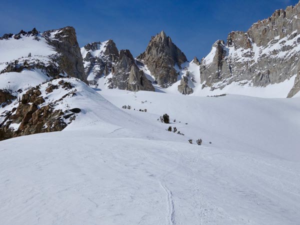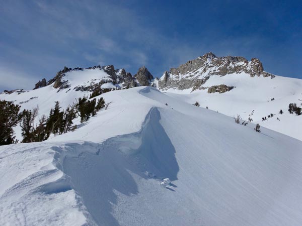 At around 8800′ we skinned up the headwall and followed the drainage toward Twin Peaks. Then we wrapped back around and headed up the NE ridge toward Matterhorn Peak. It follows a lightly corniced ridge right up to the basin of Matterhorn Peak.