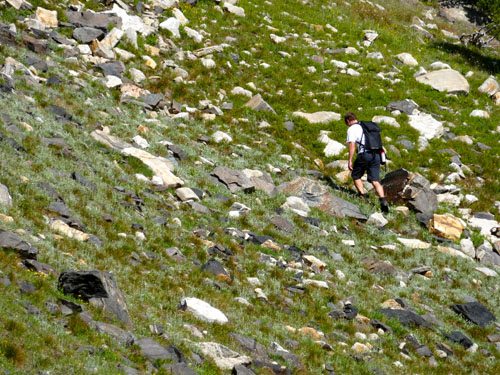 Due to a bit of a time crunch and the darkening clouds, we quickly descended the East ridge. Instead of returning by the same route, we descend down to Dudley Lake. It was easier walking than our ascent route, and would be recommended for most people heading up to climb Wilson Peak.