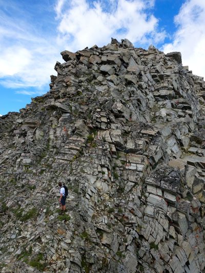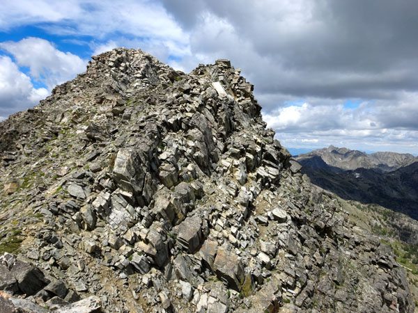As we approached the summit at 10,705′ or 3263 meters, beautiful couloirs lacking snow dropped off the north face. The final 100 feet to the summit was a bit of a scramble up the large and loose rock, but was it was easy to move quickly and efficiently.