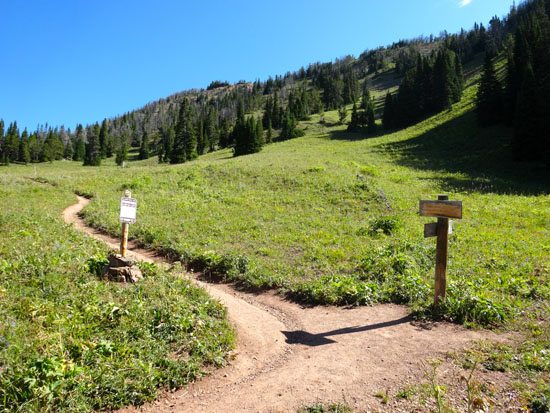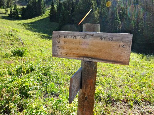 In about a mile, you’ll reach Beehive Meadows and the beginning of forest service land. The trail switchbacks several times here. At 1.3 miles, Trail 40 intersects with another trail. As the sign directs, turn left for Beehive Basin and turn right for the North Fork and Ridge Trails. At this point the Beehive Basin trail is closed to mountain bikers.