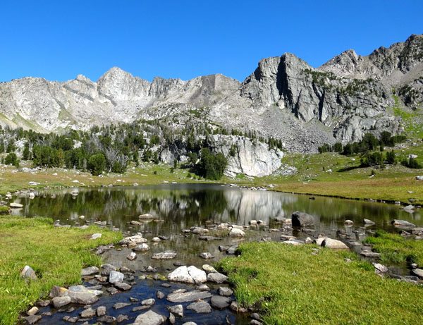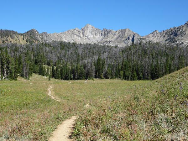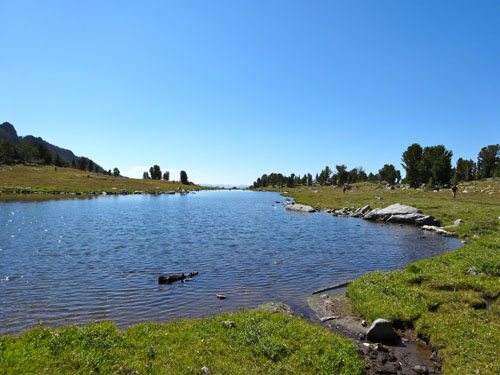 The trail crosses a massive meadow and starts to ascend. You’ll soon enter the Spanish Peaks of the Lee Metcalf Wilderness. Continue to follow the well worn trail as it ascends through more forests and meadows and passes a seasonal lake. Eventually you will come to a large, crescent shaped, unnamed lake.