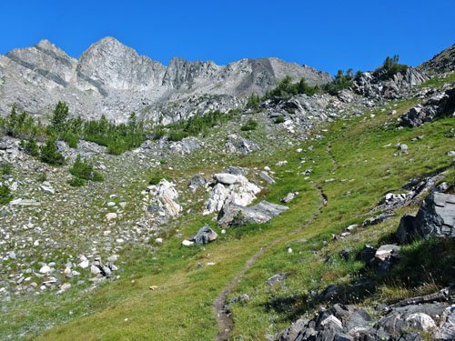 The majority of people don’t venture past the lake. I always do. Follow the trail around the lake. It continues underneath the towering granite formation called The Prow. The trail climbs steeply to about 9,600′ where the trail dead ends, but the views are in a league of their own. It’s approximately 3.9 miles from the trailhead to this point.