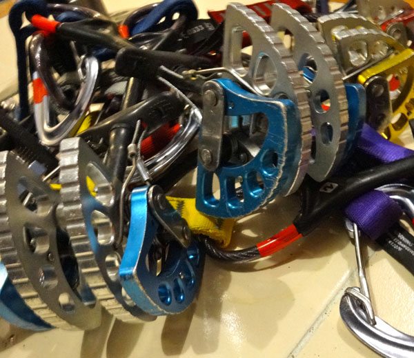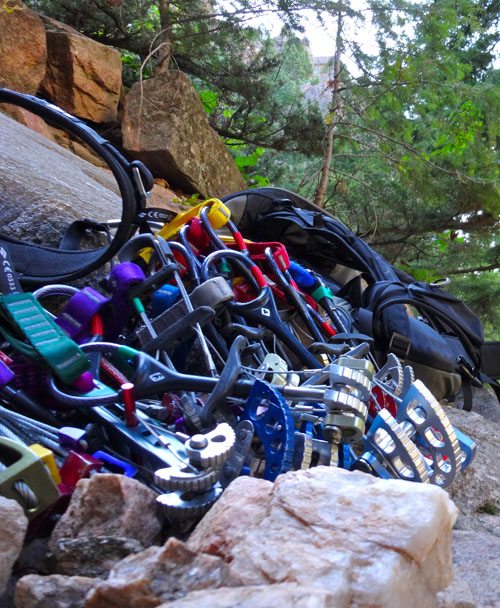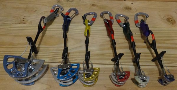 When the Black Diamond Camalots are clipped to your rack, they are easy to select as both the cam lobes and the durable nylon sling are color coded – .3 – Blue, .4 – Grey, .5 – Purple, .75 – Green, 1 – Red, 2 – Yellow, 3 – Blue, 4 – Grey, 5 – Purple, 6 – Green. If you pick up a rack pack of color coded Neutrino Carabiners or Oz Carabiners, you’ll have one sweet package for rock protection.