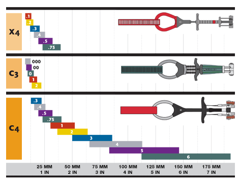 Overall the C4s cover a range of 13.8 mm to 195.0 mm. There is some overlap with the X4 cams (0.3 to 0.75). They are called C4s due to the 4 camming lobes. The exact specs for weight, strength, and range of the Camalots from Black Diamond are as followed: