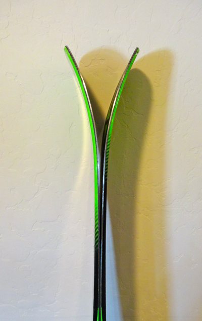 - Sidewall – Sandwich compound construction improves transmission of movements to edge by allowing constant pressure along the length of ski. This results in control, stability, and carvability. The sidewall is thick underfoot and narrows towards the tails.