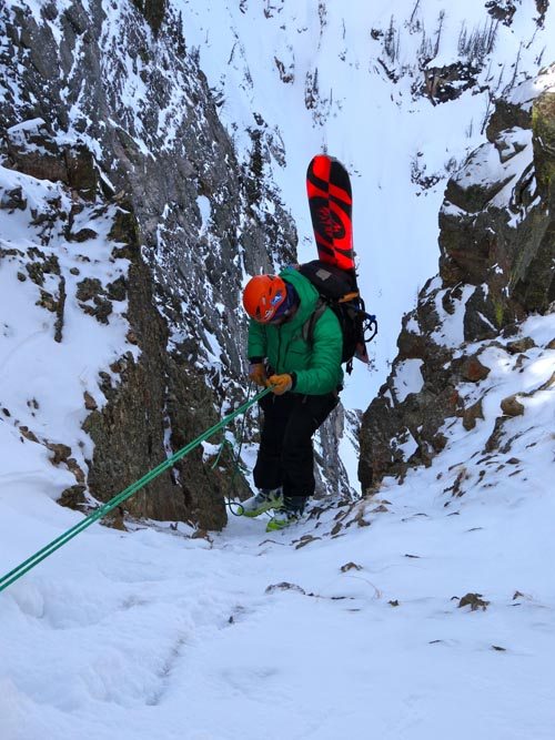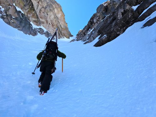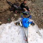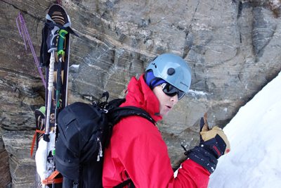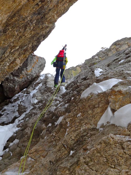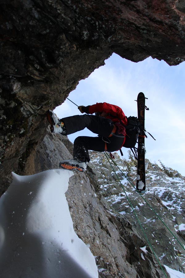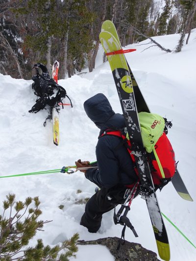 The prussic drag is a ski carry method that I have not tried, but have witnessed a few times (sorry no photos). When wearing a harness, you can attach your prussic cord to your back gear loop then run it down and attach it to your skis – thus dragging your skis behind you. I’m not sure this is a great method, but it could save a bit of weight maybe. You also better be sure you tie your knots really well so your gear doesn’t tumble down the hill without you.