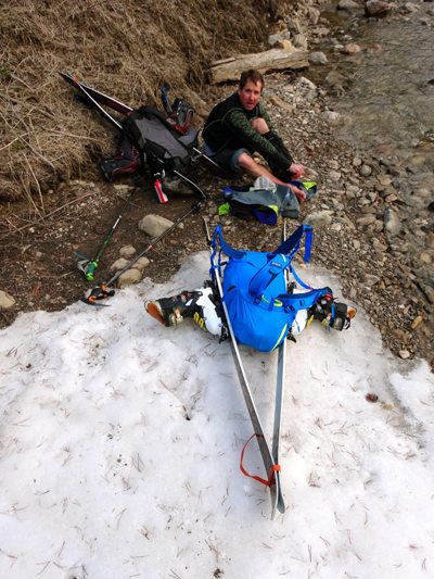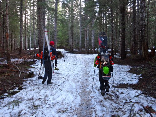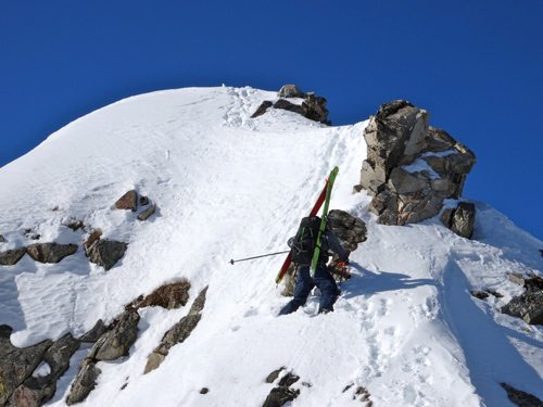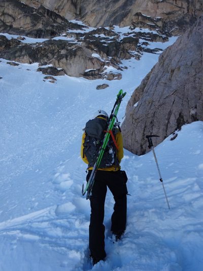 A ski guide I know lives by the 5 W’s – “We Won’t Walk Will We?” It’s a good motto to strive for, but sometimes you have no other option than to strap the skis to your back and jump on the old heel-toe express for a bit.