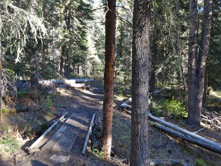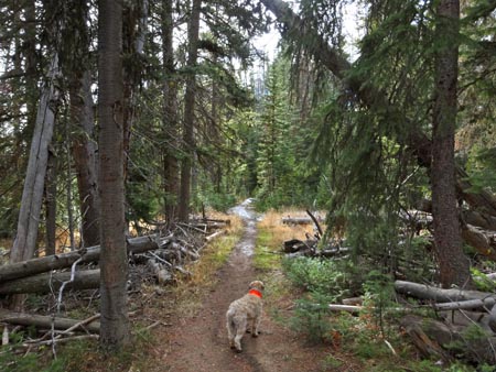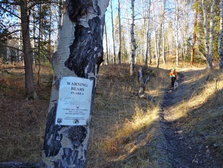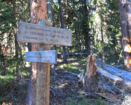 The only trail leaving the trailhead is the Cinnamon Buck Trail (Trail #6). Immediately there is a sign warning of bears that encourages you to make noise. Carry bear spray.
