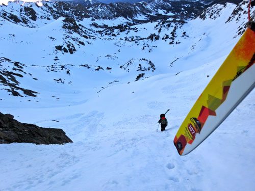 The Cham can hold an edge, arc a turn, or smear a floaty pow turn. It inspires confidence in any snow conditions, but excels in powder and soft snow – something I try to ski a lot of. It can be an everyday all mountain ski, but does lose stability on firmer snow as the large tip rocker will begin to chatter at high speeds. On the flip side, the rocker tip is ideal for breaking trail in the skin track, it floats like champion, and skims over and through breakable crust.