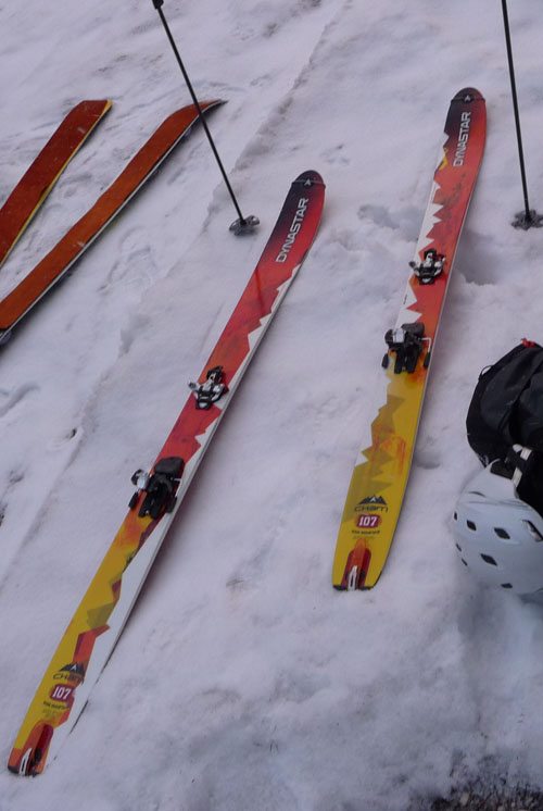 My 184 Cham HM 107s are paired with the Dynafit Radical ST bindings for a lightweight package. My skis weigh in at 5 lbs, 9 oz per ski or 11 lbs, 8 oz for the set up. They weigh in at 4.6 pounds without bindings. It’s not the lightest ski on the market, but it does the trick most of the time. Compared to the regular Cham skis, Dynastar lost the metal sheeting in the ski and the HMs are approximately 25% lighter.