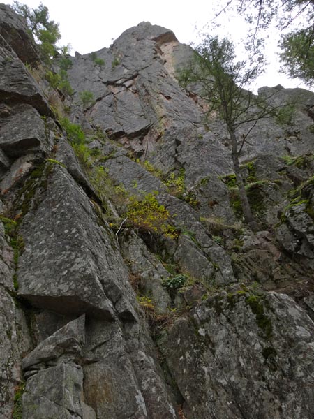 After scouring the river facing section, we identified a belay sling left on a tree and began to climb below this point. The first pitch was dirty and slick. Gneiss covered in moss and pine needles makes even a 5.5 a bit sketchy. The pitch ended at a massive ledge near the right side of the buttress. It is about 70 feet up.