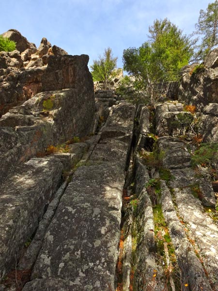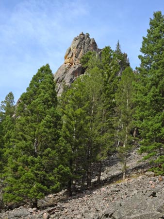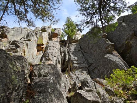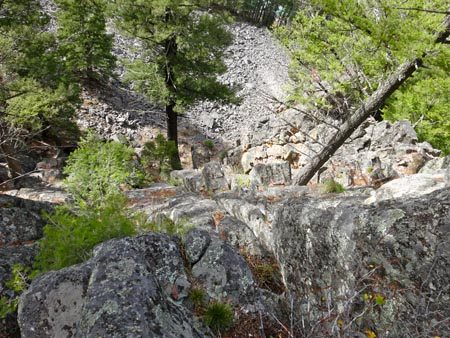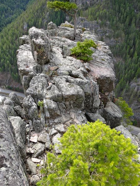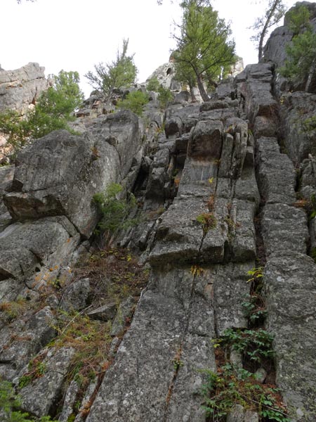 From here there is a walkoff to the East on the south side of the remaining rock. It is a bit exposed, but there are strong trees to grab as you pass these sections. A climber’s trail leads back to the base of the Pineapple Buttress. Looking up at Pineapple Buttress on the way down, we did not see another walkoff, but it is possible we missed it.
