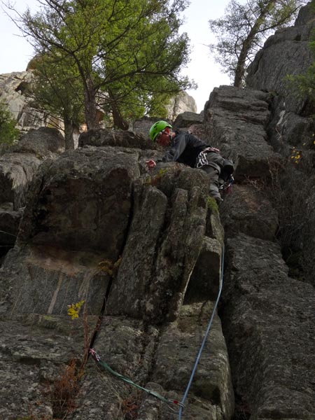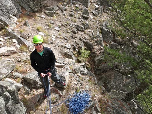 The climbing on pitch 2 was relatively easy as long as you avoided some of the loose, rotten rock. Basketball size boulders teetering on edges and flakes that felt like they were velcro-ed on helped to up the intensity on this 5.5 route. Jeremy managed to rip out a large flake while on top rope. Sketchy.