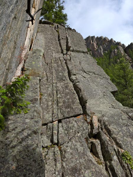 Looking up from the ledge, there are multiple chimneys and cracks to choose from. We worked out to the left side of the buttress where a we had a nice selection of routes to climb. This is a long pitch and could easily be 200′ by itself.