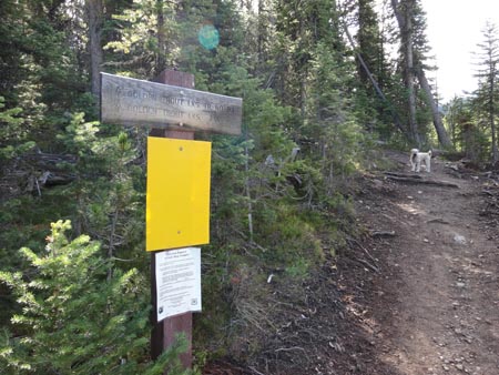 The USFS trailhead sign is next to the trail for Windy Pass. Head south out of the parking lot toward a log fence on an old logging road to access the Golden Trout Lakes trail.