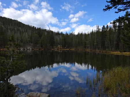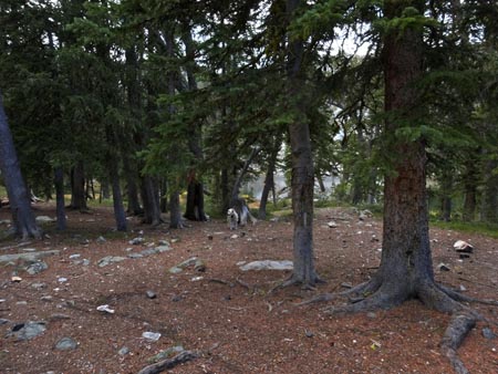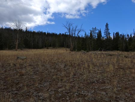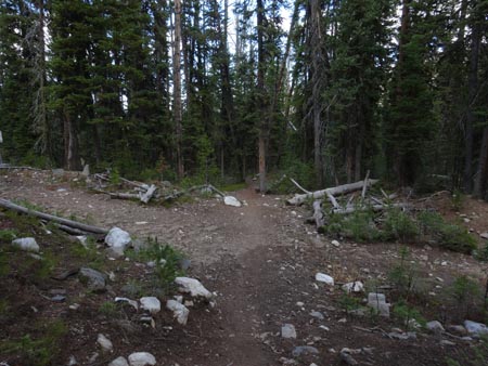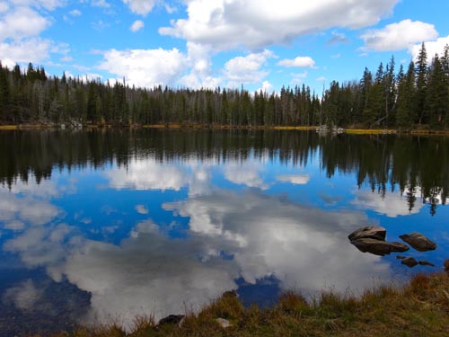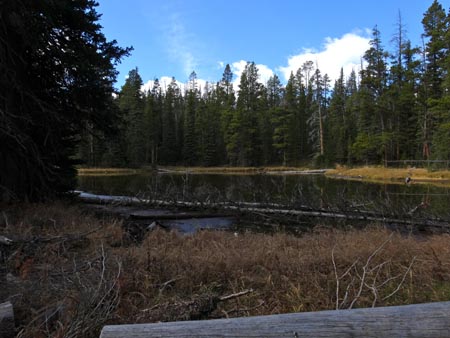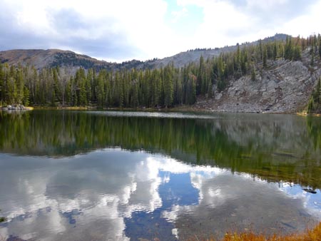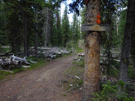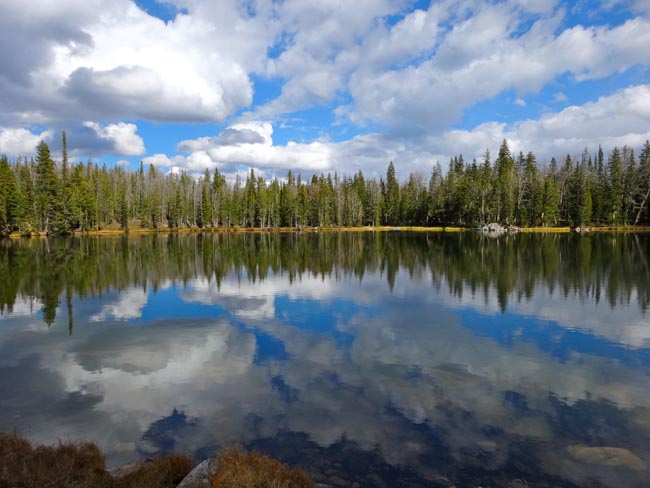 The Golden Trout Lakes trail quickly passes some small ponds and weaves through a forest of spruce and pine. In 0.6 miles it crosses an old logging road. In another 0.2 miles it passes the Hidden Lakes Trail Cut-off Trail. If you take the cut-off trail for 1.8 miles you will intersect the Hidden Lakes Trail. Stay left for Golden Trout Lakes Trail. No bikes are allowed past this point.