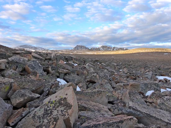 We made decent time rock hopping across the plateau trying to link together distant cairns before the sun set behind the mountains. With our late start, there was no way that we would reach the high camp near Tempest Mountain on day 1. Instead, we found a flat spot with a nicely built wind break near a permanent snowfield at about 11,100′ and set up camp there. There are campsites like this scattered across the FTD. If you plan correctly you can find a trickling stream of water or patch of snow for drinking water.