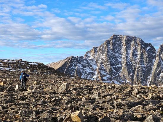 We woke at sunrise and hoofed it across the Froze To Death Plateau. Finally we had our first glimpse of the Granite fortress pocked with snow. It’s a massive mountain. Eventually we reached the super cairn at about 12,100′ near the high camp on Tempest Mountain (12,478′) where we could see more of our route.