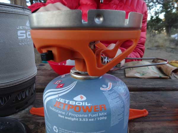 JetBoil (and many other camping stoves) use a propane/isobutane gas mix. I prefer to use the JetBoil Jetpower four-season blend for no reason other than marketing. According to JetBoil, “Propane provides higher vapor pressure for better performance in cold weather. Isobutane provides more constant pressure as the fuel level gets low.”