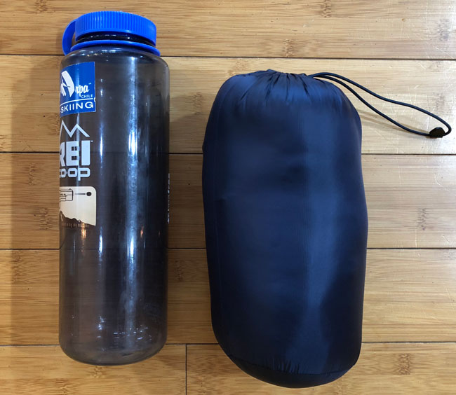 The Fenrir comes with a stuff sack if you’re into using a stuff sack. We are in and out of our jacket quite a bit and find that it’s easier to just stuff it into our pack – and it packs quite small inside the pack. For comparison sake, here’s a photo of the stuffed jacket next to a 1.5 Liter Nalgene.