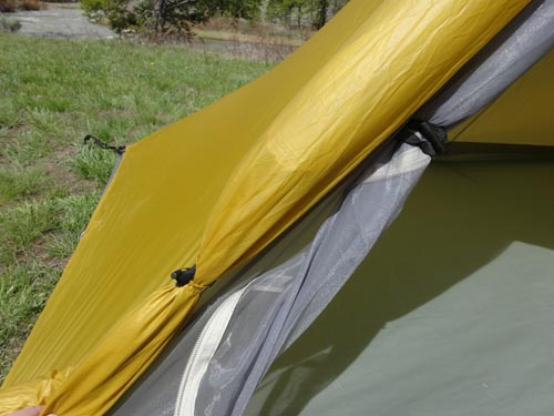 • Ventilation: The fly features covered peak vents that are always open. The lack of zippers eliminates weak points in the fly that will increase durability and longevity. For ventilation micro adjustments, you have to get out of the tent and adjust the tautness of the fly near the corners.