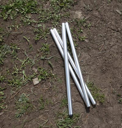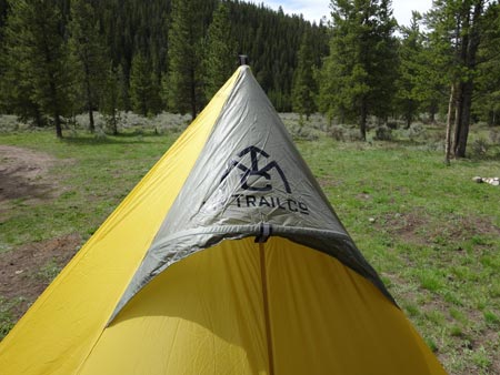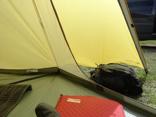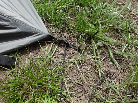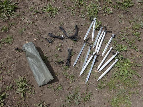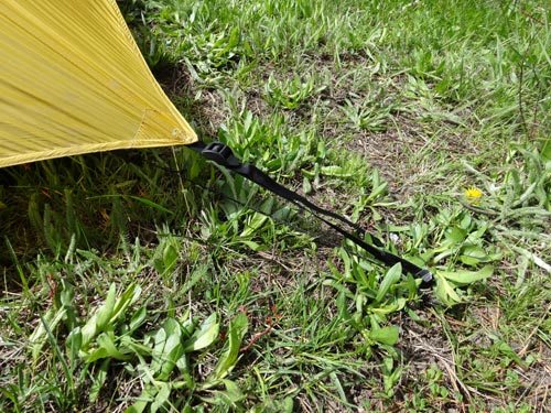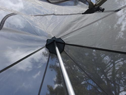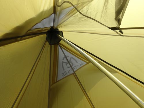 • Pole: A single, lightweight, 4 piece 19mm aluminum pole adds the height to the shelter. The bottom section of the pole extends once the pole is in place and tightens everything up. Be careful not to bump the pole too hard in the night or the whole thing can collapse! There’s no problem getting the pole in the right spot because there is both floor and ceiling reinforcements. Supposedly if you have pole issues or you’re looking to shave weight, you can hang the center point from a stout tree branch…