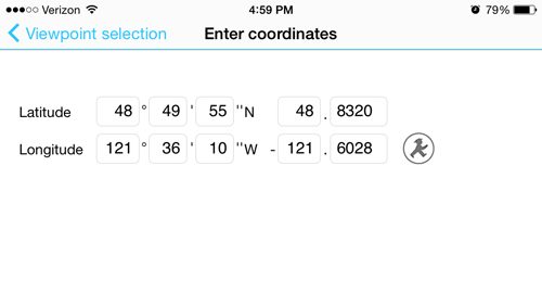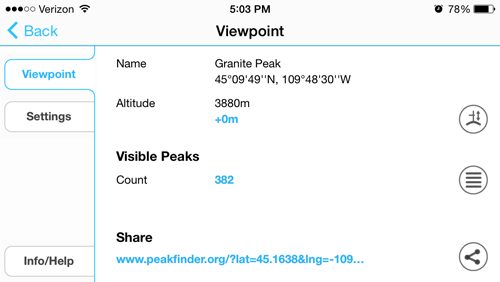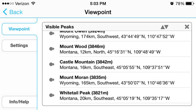 For each peak in the database you can get info like name, elevation, lat/long, and current distance from your view. With a simple tap of the small hiker icon, you’ll be standing on top of a new peak with a new panoramic peak view. You can also zoom in on satellite images to find the view from just about anywhere.