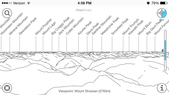 It would be nearly impossible to list every peak out there, but PeakFinder manages to capture the majority of major peaks. It’s probably more accurate in large ranges like the Cascades than smaller ranges like the Hilgards. My only complaint is that sometimes I want to know the name of a peak that isn’t in the PeakFinder database. I guess that’s why I have USGS maps or the Topo Maps app close by.