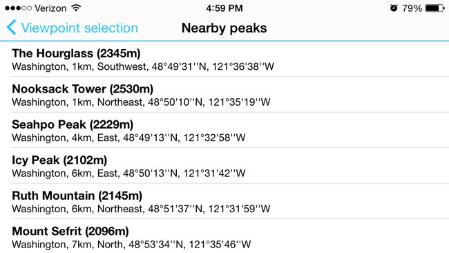 The PeakFinder app actually comes with four different versions covering different areas of the world. In total PeakFinder has nearly 100,000 peaks listed. All versions of the app work the same, but they are all sold separately. They are: