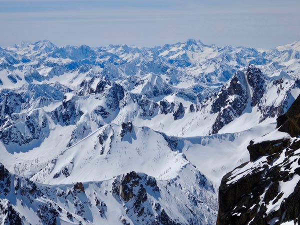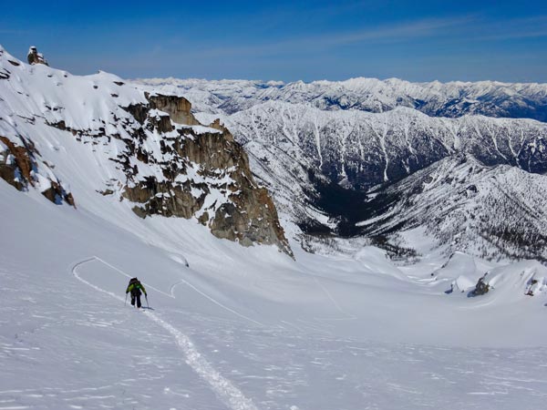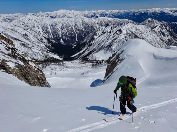 At the top of this bootpack, it flattened out and we made a zig zagging skin track all the way to the Silver Star Col at 8600′. The snow was pristine and in perfect condition. The col was massive and big enough to land a helicopter on. And the views looking out toward the North Cascades was unreal.