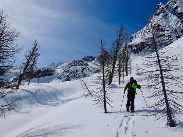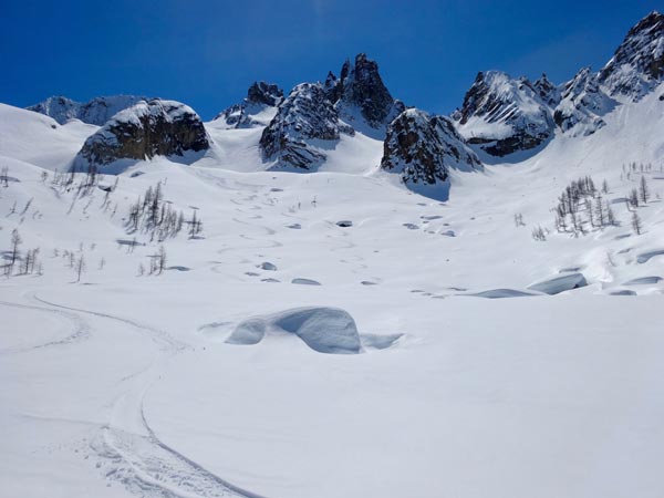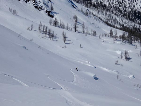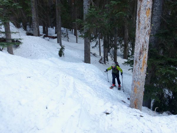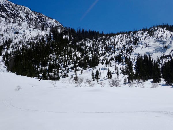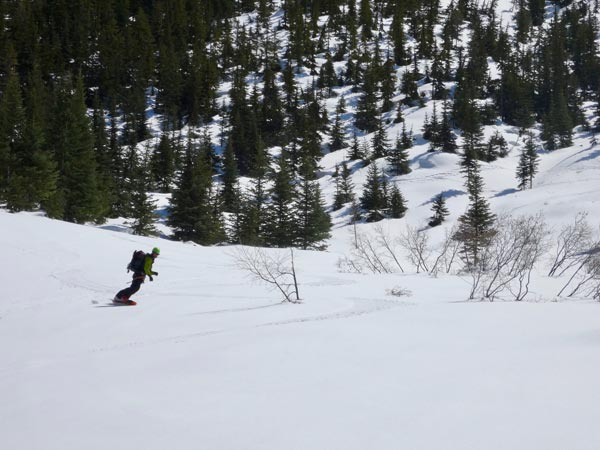At the bottom, fun playful terrain with nice corn snow allowed us to party ski through wide trees and forests back down to the flats. With one last look at the alpine terrain, we slowly slogged back across the flats and down the creek to 4400′. It’s best to steer clear of the creek from here down to the road.
