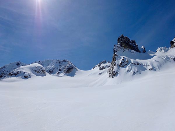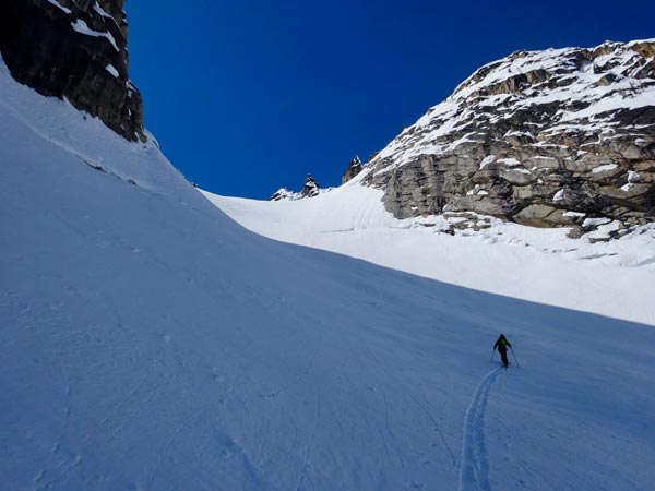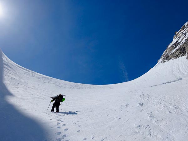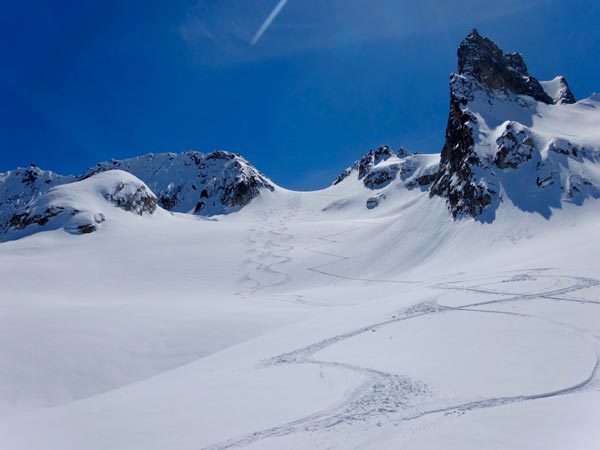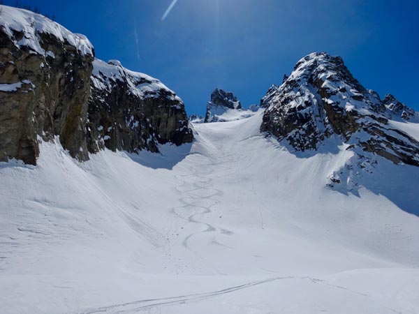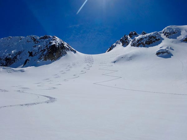 We skied one at a time and the snow was fantastic. We cruised down the glacier and through the lower chute.