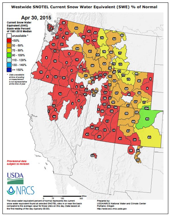 Below is the Westwide SNOTEL Current Snow Water Equivalent % of Normal as of April 30, 2105. You can find the link to this PDF file from the Natural Resources Conservation Service here.