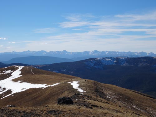 Follow the trail along the ridge. There are large wooden posts that mark the trail in case you get lost. It’s easy to head to the first high point, but the trail actually works around this to the west. On the NW side of this first summit, a narrow and sometimes snowy trail crosses a steep, rocky face – a place where we saw abundant wolf prints in the slick snow. After crossing this section, the trail becomes wide and grassy again.